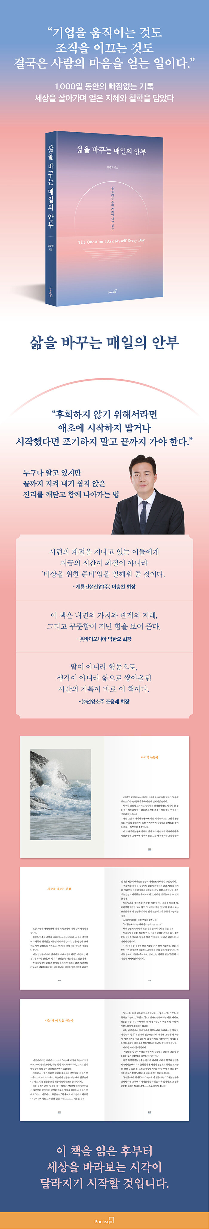 마지막 눈동자 | 차별적 역량과 좋은 네트워크 | 위기는 곧 시험 | 우리 모두의 이야기 | 소림사에게 배우는 핵심 역량 | 행동하지 않으면 아무 일도 일어나지 않는다 | 인생 경영 | 꼰대와 지혜 사이 | 시애틀에서 | 새로운 언어를 배울 시간 | 강함과 강인함 사이 | 가치관이라는 나침반 | 기업인이 존중받는 사회 | 세상을 바꾸는 관점 | 설계는 머리로, 증명은 몸으로 | 경험이 만드는 리더십 | 재점검 | 마법을 펼치는 다섯 가지 열쇠 | 존재 가치 | AI 경영, 선택이 아닌 필수 | 회복탄력성 | 채널을 바꾸는 용기 | 오리지널스로 살아가기 | 질문하는 습관 | 노력의 진짜 의미 | 경험을 파는 브랜드 | 강소기업의 꿈 | 특이점의 시대 | 사업의 매력 | 틀을 뛰어넘는 생각 | 보이지 않는 길을 찾는 법 | 영업의 본질 | 기술을 시장과 연결하는 전략 | 왜 이 일을 하는가 | 책을 읽고 깨달은 단 한 가지 | 변화의 출발점