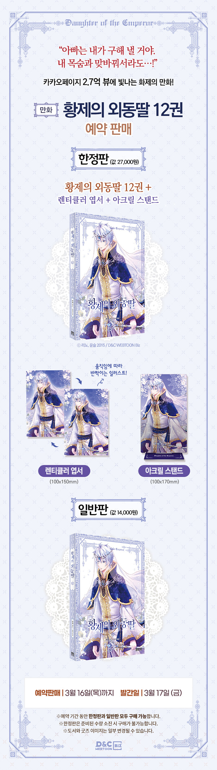 · 제목 : 황제의 외동딸 12 한정판 (렌티큘러 엽서 + 아크릴 스탠드) (만화)