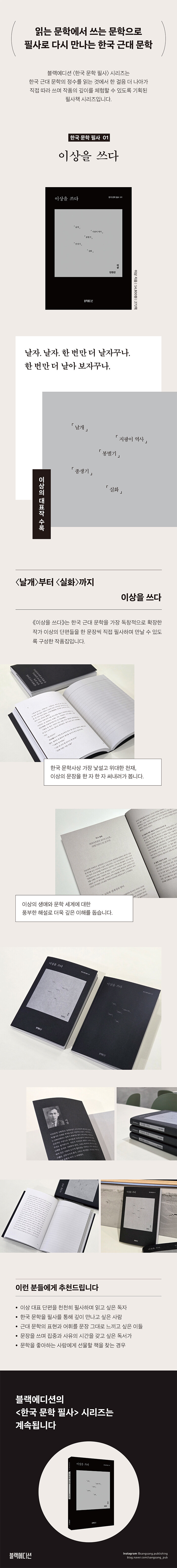 읽는 문학에서 쓰는 문학으로 나아가는 필사 시리즈다. 이상의 단편을 손으로 옮겨 적으며 문장의 리듬과 사유를 천천히 체감하게 한다. 빠른 독서에서 놓치기 쉬운 근대 문학의 언어를 자신의 속도로 다시 읽게 돕는다.