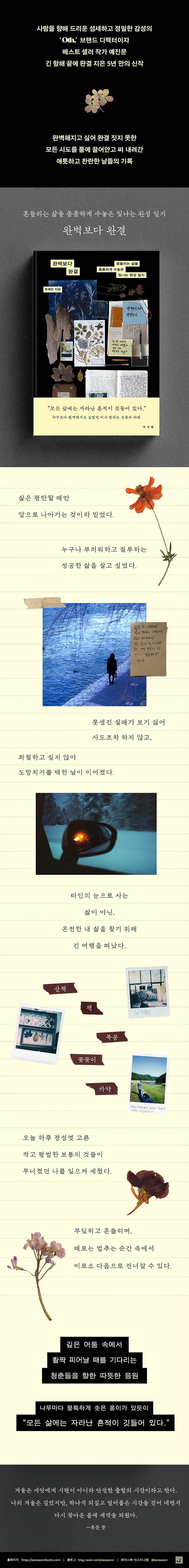 어떤 책은 마지막 책장을 넘긴 후에도 쉽사리 손에서 내려놓지 못하기도 한다. 《완벽보다 완결》은 한 권의 책이라기보다 누군가가 정성 들여 꾸미고 쓴 일기장을 들여다보는 것 같다. 주홍빛 윤슬과 짙은 초록의 풍경, 하얀 설산의 핀란드 사진, 색색의 압화, 직접 손으로 쓴 메모는 활자와는 다른 감흥을 준다. 속 깊은 문장들은 담담하게 읽는 이의 시선을 빼앗는다. 이쯤 되면 작품을 보는 것 같다.