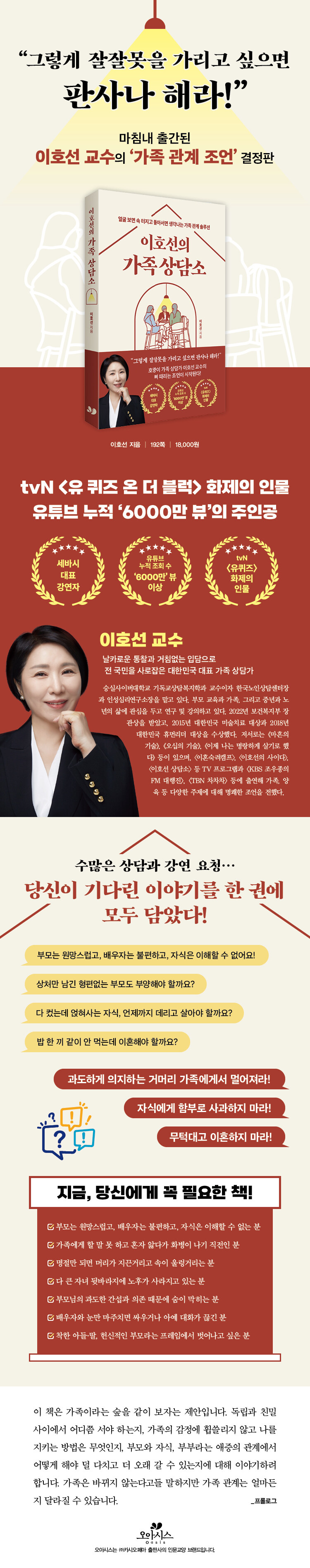 ⟨이혼숙려캠프⟩, ⟨이호선 상담소⟩ 등 다양한 TV 프로그램과 강연에서 가족 관계에 대한 날카로운 통찰과 현실적인 조언을 전하며 수많은 상담 요청을 받아 온 이호선 교수의 가족 상담 결정판이 마침내 출간되었다. 《이호선의 가족 상담소》는 이호선 교수의 가족 관계 핵심 조언을 한 권에 집약한, 독자들이 오래 기다려 온 ‘가족 관계 설명서’다. 수많은 상담과 연구를 통해 얻은 가족 관계에 대한 통찰과 돌려 말하지 않는 저자의 거침없고도 현실적인 조언이 더해져 가족이라는 이름 아래 감춰졌던 문제에 정면으로 맞선다. 다 컸지만 독립하지 않는 ‘캥거루족’ 자녀, 부모 자격이 없는 부모, 남보다 못한 배우자와의 이혼 등 대표적인 사례를 마주하며 독자는 자신의 가족 관계를 자연스럽게 돌아볼 수 있다.