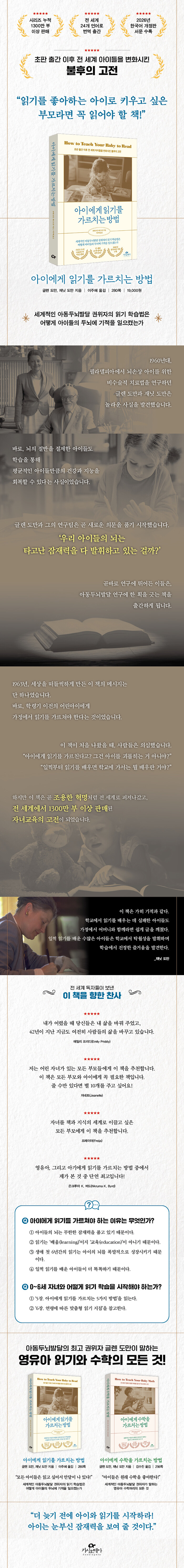 이 책은 단순한 조기교육 지침이 아니다. 어른들이 흔히 갖고 있는 ‘너무 이른 학습은 해롭다’라는 선입견을 깨고, 왜 영유아 시기가 배움의 황금기인지 과학적 근거와 실제 사례로 설득한다. 나아가 부모가 집에서 바로 실천할 수 있는 단계별 읽기 학습법을 제시해, 읽기를 놀이처럼 자연스럽게 생활 속에 녹여 낼 수 있도록 돕는다.