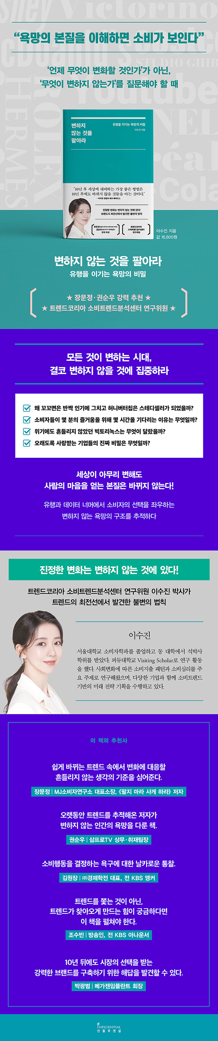 트렌드코리아 소비트렌드분석센터 연구위원 이수진 박사의 《변하지 않는 것을 팔아라》는 변화에 휘둘리지 않고 그 흐름을 읽어내기 위해 현상의 이면에 숨겨진 인간의 기본 욕구를 추적한다. 시대를 관통하는 영원 불변의 원리를 이해하는 것은 내일을 준비하는 가장 확실한 기준이 된다. 위기 속에서도 살아남는 것들은 무엇이 다른가. 그것들은 화려한 유행을 따르는 대신 사람들을 실제로 움직이게 만드는 요인에 집중한다. 세상이 아무리 변해도 사람의 마음을 얻는 본질은 바뀌지 않기 때문이다. 무엇을 끝까지 지켜야 하는지를 고민하는 순간, 비즈니스는 단기 성과를 넘어 지속 가능한 방향성을 갖게 된다.
