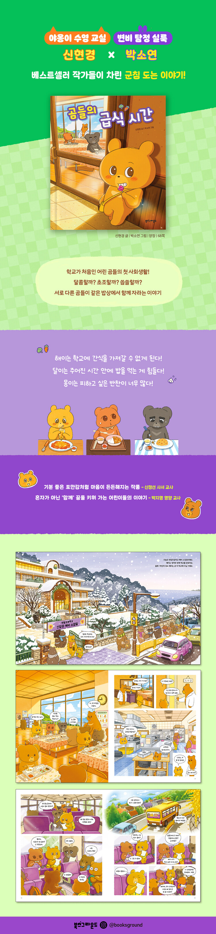 어린이들이 믿고 보는 두 인기 작가가 만나 그래픽노블 《곰들의 급식 시간》을 선보인다. 〈야옹이 수영 교실〉의 신현경 작가와 〈변비 탐정 실룩〉의 박소연 화가가 함께한 작품으로, 학교에 첫발을 디딘 어린 곰들의 일상을 유쾌하게 그렸다.