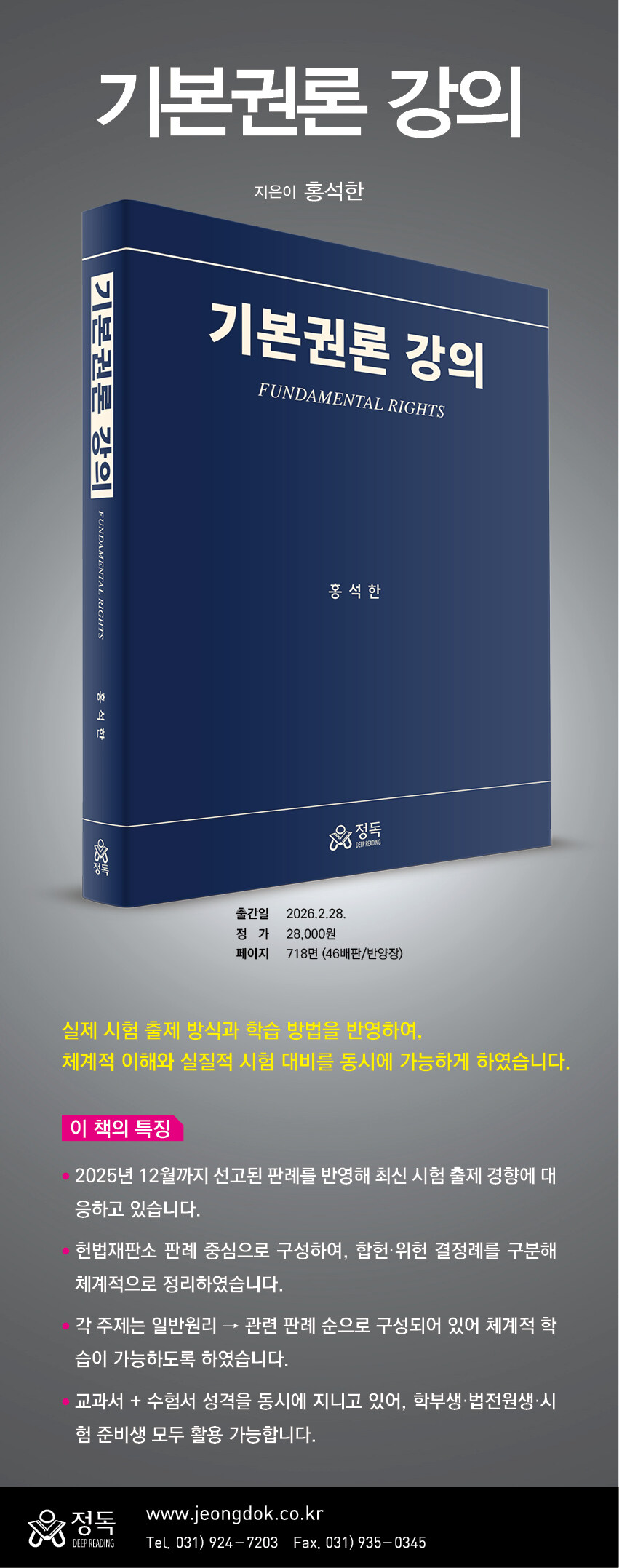 헌법상 기본권을 체계적으로 학습하기 위한 교과서이자 각종 시험에 대비하기 위한 수험서다. 헌법재판소가 채택한 개념과 법리, 판례 표현을 충실히 반영했고 2025년 12월 말까지의 판례를 담았다. 일반원리와 주요 결정례를 합헌·위헌으로 구분해 서술형과 선택형 시험을 함께 대비하도록 했다.