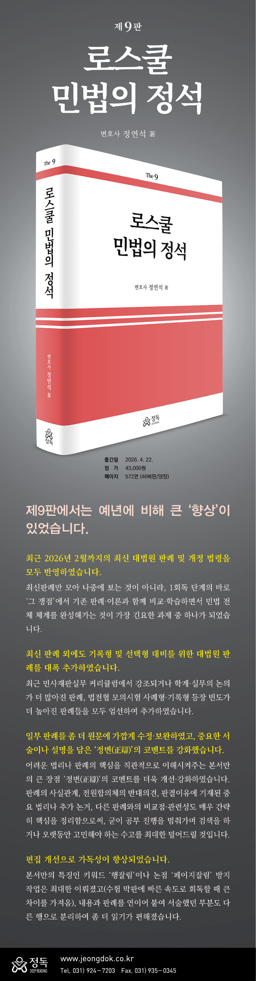 제9판에서는 가장 최근 2026년 2월까지의 최신 대법원 판례 및 개정 법령을 모두 반영하였다. 최신판례뿐 아니라 기록형 및 선택형 대비를 위한 판례도 특히 많이 추가하였고, 일부 판례를 좀 더 원문에 가깝게 수정·보완하였다.