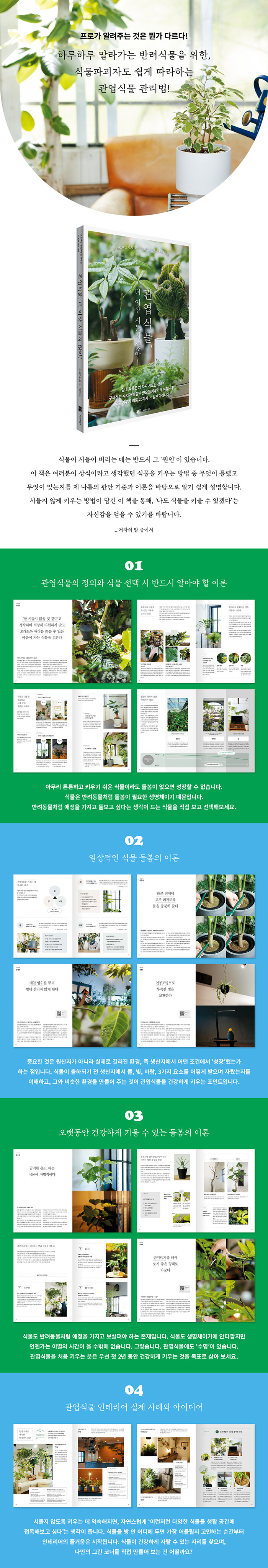 이 책에서는 5파트로 나누어 식물 돌봄을 이야기합니다. 파트 1에서는 ‘시들지 않게’ 키우기 위한 돌보기의 기본 자세를 소개합니다. 파트 2에서는 식물을 구입해서 집으로 들여오는 과정을 다루고, 파트 3과 파트 4에서는 시들지 않게 키우기 위한 기본 관리와 오래 건강하게 키울 수 있는 포인트를 이론을 통해 해설합니다. 마지막으로 파트 5에서는 관엽식물을 활용한 인테리어의 실제 사례와 아이디어를 소개합니다.
