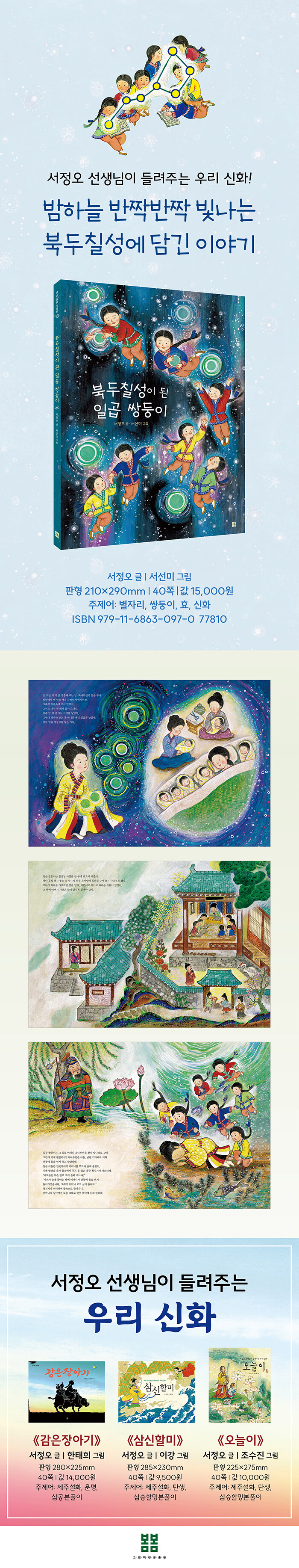 《삼신할미》, 《오늘이》, 《감은장아기》에 이은 네 번째 신화 이야기로, 여러 전승을 참고해 서사를 풍부하게 구성했다. 서선미의 신비로운 색감의 그림이 일곱 쌍둥이의 모험과 환상적 분위기를 더한다.