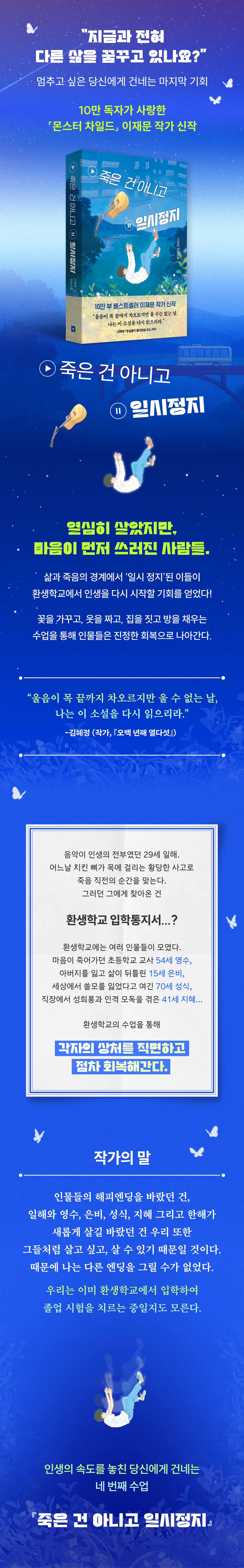 10만 부 베스트셀러 『몬스터 차일드』 이재문 작가의 장편소설. 이번 생은 망했다고 말하는 시대에 선사하는 힐링 판타지. 유일한 인생을 살라는 이름 ‘유일해’로 살아왔지만, 스물아홉 인생 내내 독보적인 존재였던 적은 한 번도 없었다. 음악을 위해 청춘을 모두 바쳤지만, 돌아오는 건 무관심뿐. 그런데, 어이없게도 치킨을 먹다 죽기 직전이라니.