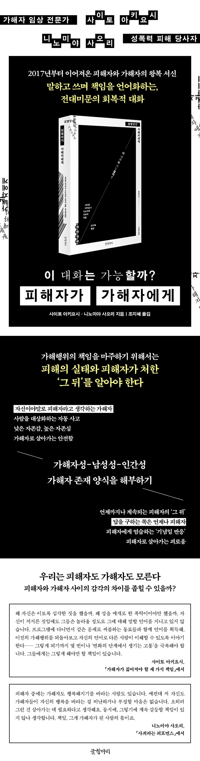 이곳에는 명백히 피해자와 가해자가 있다. 두 존재의 양식을 무화하지 않는 엄격함 위에서, 이들은 대화할 수 있을까. 대화를 밀어붙임으로써 성폭력 가해자가 변화할 수 있을까. 물론 대화만으로 행동 변화를 촉진할 수는 없다. 이를 사이토도 니노미야도 알고 있다. 그러나 변화의 요인을 탐지하고 개발하며, 끄집어지지 않은 가해자성을 해부하는 일은, 실패한 대화조차 무용하지 않다는 믿음 위에서 이어진다. 타인과의 대화는 필연적으로 존재를 다시 쓰는 일이다. 이 또한 이 책에 도사리는 진실이다.