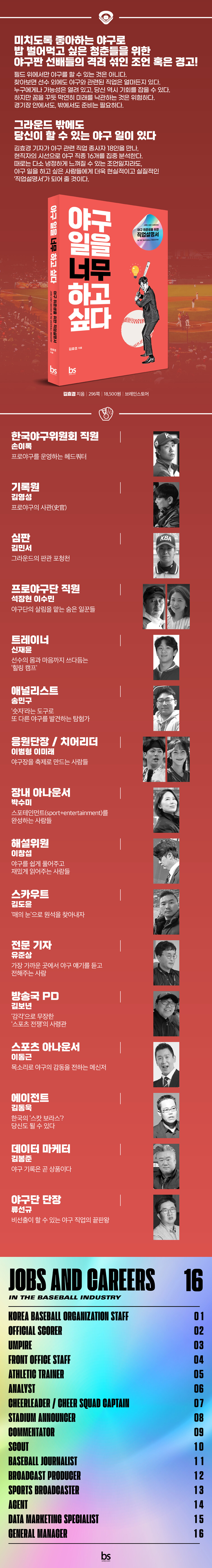 『야구 일을 너무 하고 싶다』는 다양한 야구 관련 직업군을 소개하는 데 그치지 않고, 각 분야에서 요구되는 역량과 진입 경로, 그리고 현업 종사자들의 생생한 경험을 통해 독자가 스스로 자신의 위치를 점검할 수 있도록 돕는다. 나아가 독자들의 환상을 걷어내고, 보다 구체적이고 실질적인 준비를 할 수 있는 방향을 제시한다. 이 책은 누군가에게는 친절한 길잡이가 될 수도, 또 다른 누군가에게는 냉정한 현실을 일깨우는 책이 될 수도 있다. 이 책에는 야구와 관련된 직업을 꿈꾸는 이들에게 도움이 될 실질적인 정보와 조언이 담겨 있지만, 동시에 그 길이 결코 쉽지 않다는 사실 또한 분명하게 전한다. 야구가 좋아서 시작했지만, 결국 ‘일’로서의 야구를 고민하는 사람들에게 이 책은 하나의 현실적인 안내서가 되어줄 것이다.