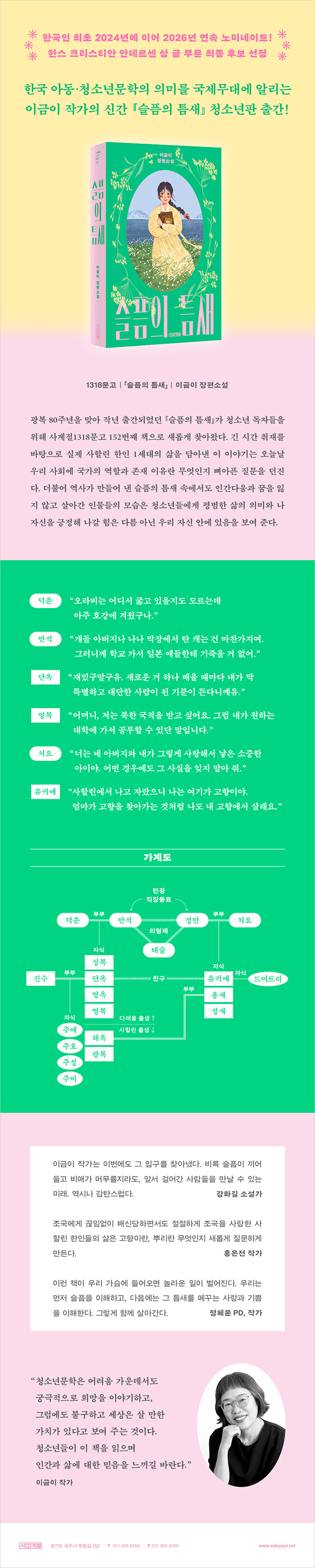 그 3부작의 완결인 『슬픔의 틈새』는 강제징용으로 탄광 노동자가 된 아버지를 찾아 사할린으로 떠난 열세 살 주단옥의 일생을 담는다. 지배 국가가 여러 번 바뀌어 온 사할린은 그 자체로 디아스포라적 역사성을 지닌다. 흩어진 사람들, 경계인을 의미하는 디아스포라는 어른과 아이 사이 어딘가에 걸쳐 있는 우리 사회 속 청소년을 떠올리게 한다. “공부를 이유로 많은 것을 유예당하는 청소년들이 이 책을 읽으며 인간과 삶에 대한 믿음을 느끼길” 바라는 작가의 마음을 담아 사계절1318문고로 『슬픔의 틈새』가 새롭게 독자들을 찾아왔다.