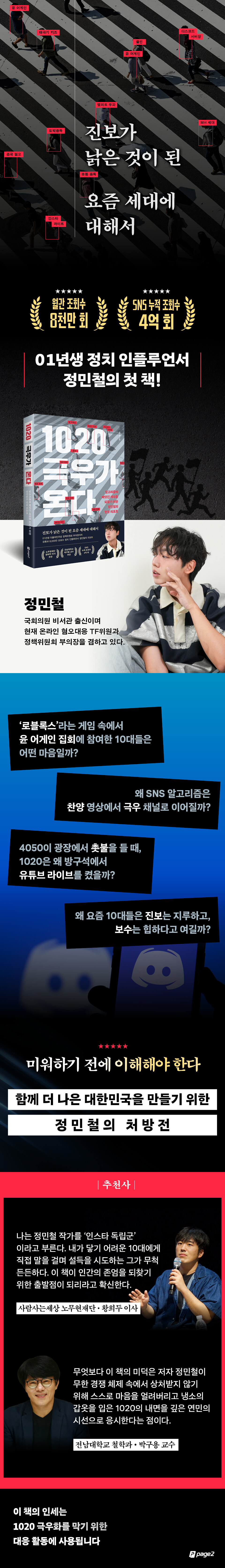 기성세대의 시선이 닿지 않는 곳에서 그들만의 알고리즘과 암호로 결집하는 이들의 행동은 단순한 사춘기의 방황이 아니다. 이는 그들이 세상을 바라보는 문법 자체가 달라졌음을 의미하며, 기성세대가 세운 공정과 정의의 기준을 자신만의 언어로 해석하고 소통하고 있는 것이다. 지금까지 일부 소수가 한때 보이는 치기라고 애써 외면했다면 이제는 이들의 속내를 살펴볼 시간이다. 그동안 지켜낸 민주주의가 뿌리부터 흔들리기 전에, 정민철이 분석한 1020 극우화의 실체와 지금 집 안까지 침투한 민주주의의 위기를 직시해야 한다.