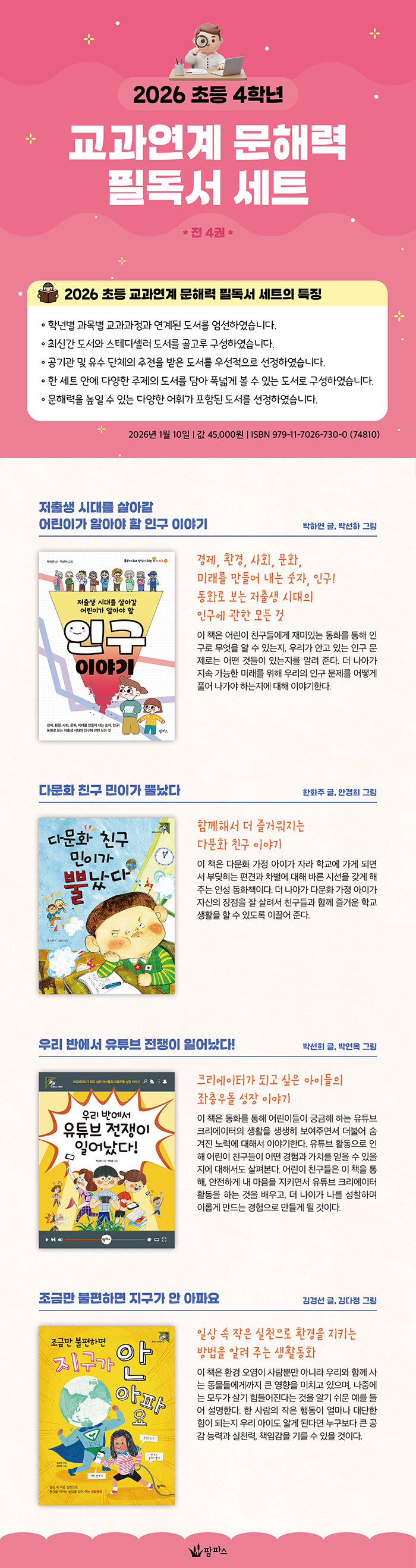 2026 초등 교과연계 문해력 필독서 세트는 학년별·과목별 교과과정과 연계된 도서를 엄선하고 최신간과 스테디셀러를 균형 있게 구성했으며, 공기관과 유수 단체의 추천 도서를 우선 선정해 신뢰도를 높였다. 또한 한 세트 안에 다양한 주제의 도서를 담아 폭넓은 독서를 가능하게 하고, 문해력 향상에 도움이 되는 풍부한 어휘를 갖춘 도서들로 구성했다.