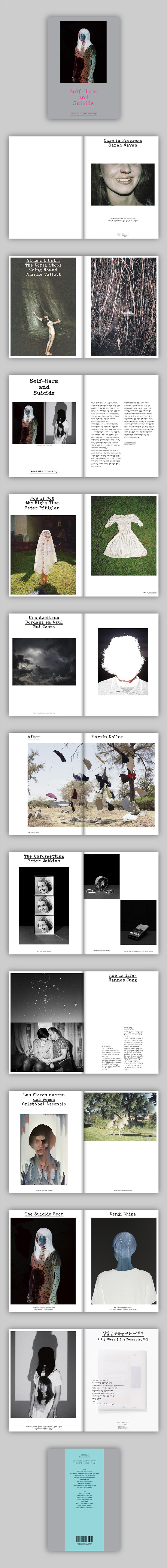 하지만 어느 가치가 더 중요한지, 어떤 선택이 더 옳은지 저울질하고, 이치를 따지는 일보다 중요한 것은 지금 이 순간에도 세상에는 자해와 자살을 선택할 수밖에 없는 이들이 존재한다는 사실이다. 이번 호 특집 ‘자해 그리고 자살’에서는 모호한 관념이나 피상적인 숫자가 아닌 구체적인 이미지를 통해 그들의 존재를 환기하고자 한다. 이를 위해 자해와 자살을 주제로 다루면서 어떤 이가 지나온 생의 흔적을 고스란히 보여주는 사진 작업을 소개한다. 그리고 정혜윤, 남궁인, 이예지, 임민경, 김신식 등의 필자가 쓴 에세이를 통해 ‘자해와 자살’이라는 문제 앞에서 우리에게 필요한 시선과 태도를 함께 고민해 본다.