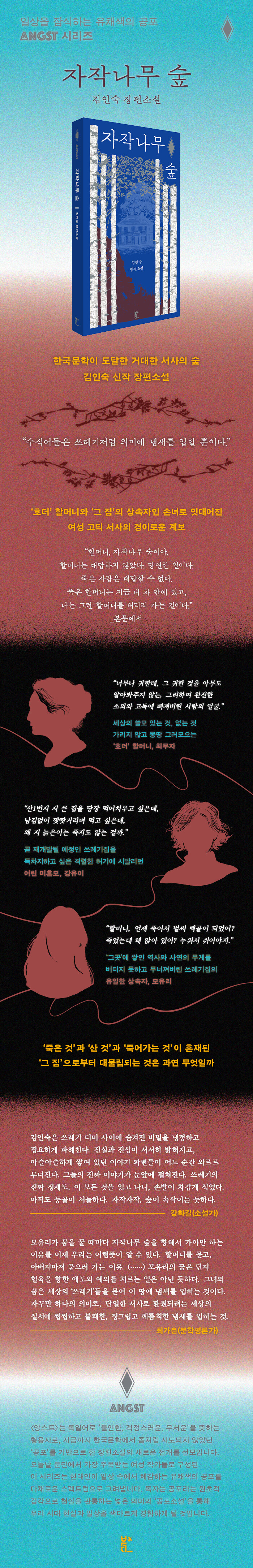 앙스트 시리즈 두 번째 작품으로 김인숙의 장편소설 『자작나무 숲』이 출간되었다. 쓰레기를 모으는 할머니와 그 집의 상속자인 손녀의 관계를 통해, 여성의 시간과 서사가 축적된 공간을 거대한 서사의 숲으로 펼쳐 보인다.