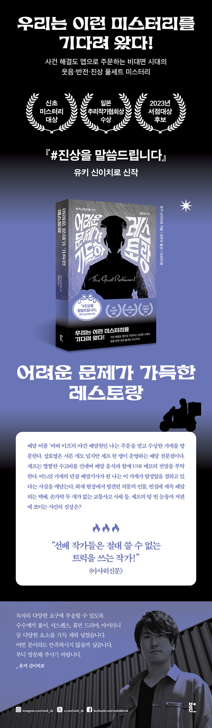 지금 일본에서 가장 주목받는 미스터리 작가 유키 신이치로의 신작. 『어려운 문제가 가득한 레스토랑』은 음식배달 어플 ‘비버 이츠’의 배달기사와 셰프 탐정이 사건을 해결하는 컨템포러리 미스터리로, 비대면 시대의 기묘한 사건과 반전의 재미를 그린다.