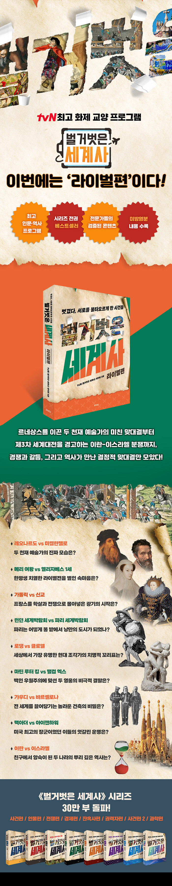 그렇다면 ‘라이벌’이라는 관계는 어떻게 역사를 바꿔왔을까요? 이 책은 tvN 최고의 교양 프로그램 〈벌거벗은 세계사〉에서 다룬 내용 중 다양한 라이벌들의 결정적 맞대결들을 모아 만든 책입니다. 왕권을 두고 벌이는 권력 경쟁, 서로 다른 종교를 둘러싼 전쟁, 당대 최고 예술가들의 작품 대결, 절친에서 앙숙이 된 나라들의 대립, 각자의 이념을 내세운 패권 다툼, 세계 1위를 두고 싸우는 도시들 등 역사 속 라이벌을 새로운 시각에서 이야기합니다. 특히 시간 관계상 방송에서 미처 보여주지 못했던 내용까지 상세하게 정리해 세계를 움직여 온 라이벌의 존재와 우리가 몰랐던 경쟁과 갈등의 뒷모습까지 확인할 수 있습니다.