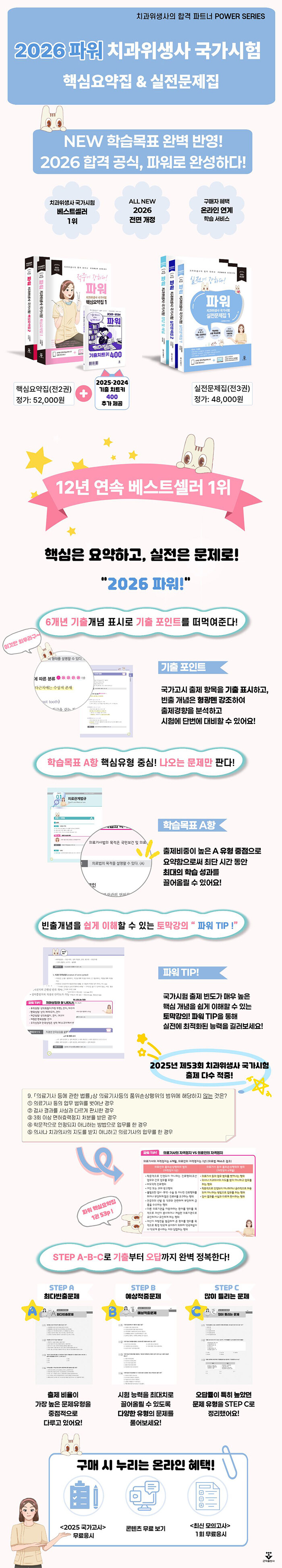 2026 파워 치과위생사 국가시험 최신 개정판이 2025 기출 트렌드까지 반영해 출간됐다. 12년간 최다 합격생을 배출한 파워 시리즈의 노하우를 담았고 핵심요약집과 기출치트키, 3,300제 실전문제집, 스마트에듀K 온라인 학습까지 지원하는 국가시험 종합 대비서다.