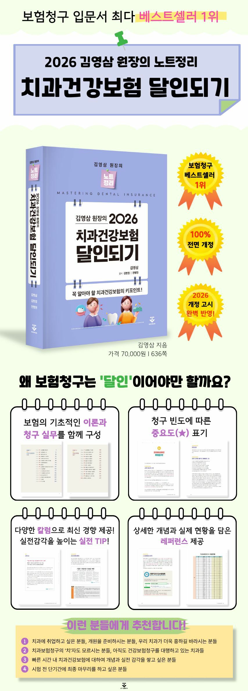 [2026 치과건강보험 달인되기]가 2026년에 업데이트된 보건복지부 및 건강보험심사평가원의 고시 내용을 전면 반영하여 새롭게 출간되었습니다. 어려운 치과건강보험을 쉽게 이해할 수 있도록 저자의 경험을 바탕으로 일목요연하게 노트정리 형식으로 기술한 것이 이 책의 가장 큰 특징입니다.
