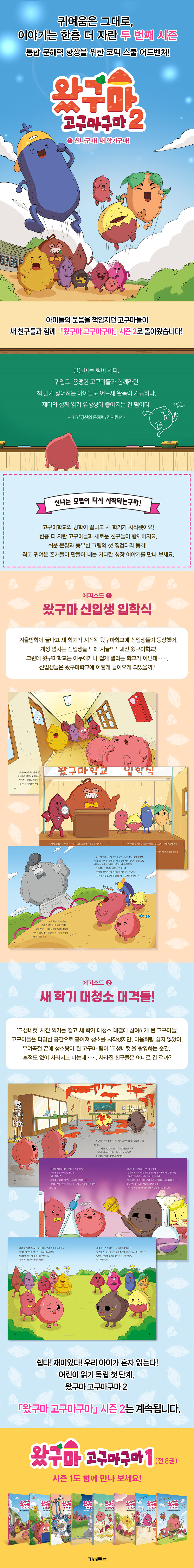 초등 독자들을 사로잡은「왔구마 고구마구마」가 한층 확장된 이야기로 다시 시작된다. 「왔구마 고구마구마」시즌 2는 기존 고구마 캐릭터들의 익숙한 매력을 그대로 유지하면서도, 새로운 캐릭터들이 등장하고, 학교라는 무대를 통해 더욱 풍성해진 이야기와 관계를 담아낸다.