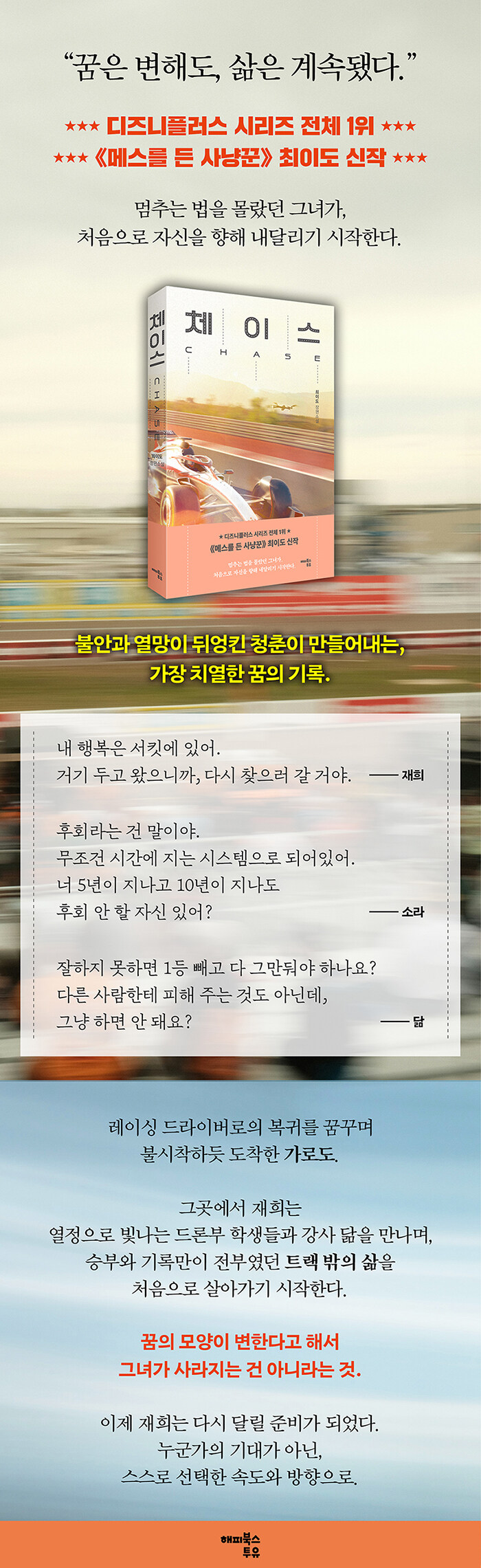 직관적이고 담백한 문체로 극강의 긴장감을 자아내는 최이도의 신작, 《체이스》가 출간됐다. 《메스를 든 사냥꾼》으로 독자들을 사로잡으며 디즈니플러스 시리즈 1위까지 기록했던 최이도가, 이번에는 전작과 완전히 다른 장르로 다시 한번 탁월한 스토리텔링을 선보인다.