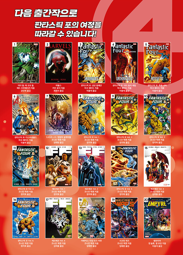 거대 벌레! 살아 있는 방정식! CEO가 된 조니 스톰! 폭발하는 불안정 분자! 얀시 스트리트 갱의 숨겨진 비밀! 그리고 전에 없던 수준으로 격한 소동을 벌이게 되는 휴먼 토치와 씽까지! 웃음, 눈물, 환호가 한데 어우러진 모험들! 스탠 리 & 잭 커비 이후 가장 사랑받은 판타스틱 포 작가진이 유쾌하고 유머 넘치는 이야기를 펼쳐 보인다.