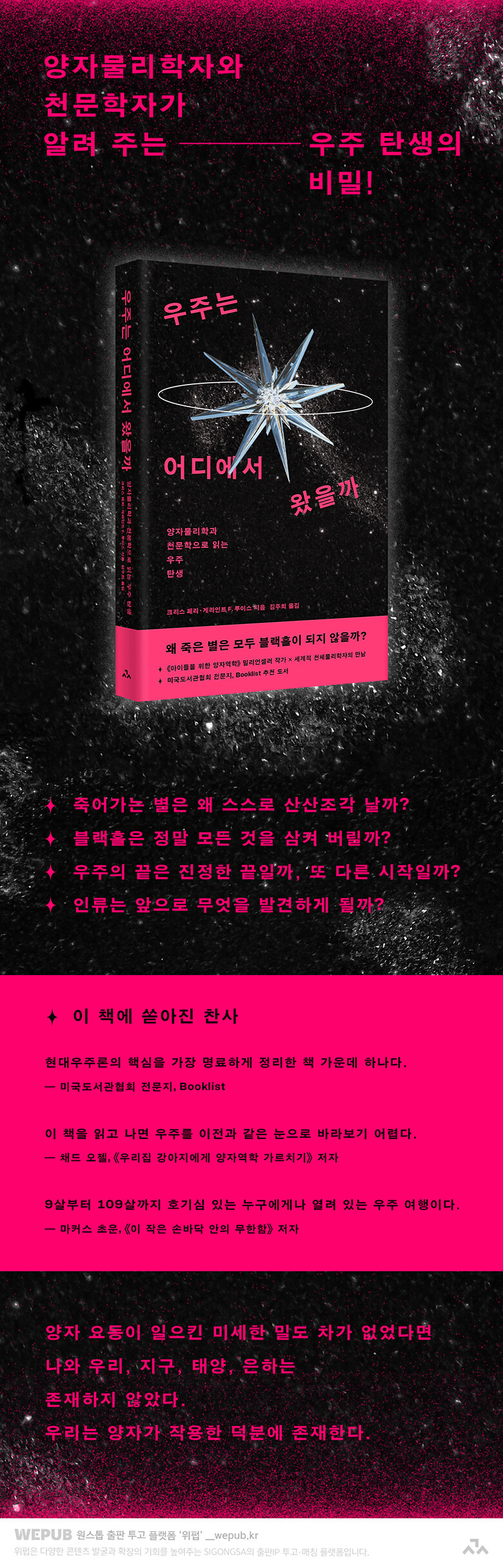저자들은 세계적인 양자물리학자와 천체물리학자로, 복잡한 이론을 대중의 언어로 풀어내며 독자들의 호기심을 사로잡는다. 실험과 관측, 최신 우주론 연구를 바탕으로 질문의 흐름을 놓치지 않도록 안내한다. 《우주는 어디에서 왔을까》는 우주를 설명하지만, 결국 우리가 서 있는 자리를 묻는 책이다. 가장 작은 세계에서 우주를 다시 올려다볼 때, 우주는 더 이상 막연한 신비가 아니라 생각할 수 있는 질문이 된다. 이 책은 그 질문으로 향하는 출발점이다. 거대한 것과 미세한 것, 그사이에 존재하는 모든 것을 아우르는 우주에 호기심을 품은 모든 이에게 이 책을 바친다.