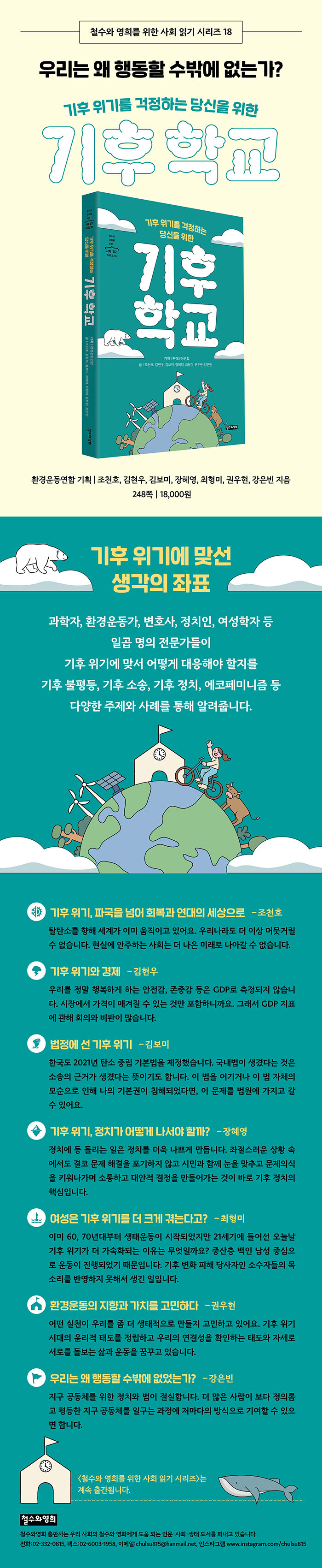 이 책은 환경운동연합이 2025년 8월 ‘청년 기후 학교’란 이름으로 진행한 강좌의 주요 강의 내용을 엮었다. 이 책에 담긴 이야기들은 기후 위기 앞에서 막막함을 느끼는 이들에게 생각의 좌표를 제공하고, 각자의 자리에서 행동으로 나아갈 수 있는 작은 출발점이 될 것이다.