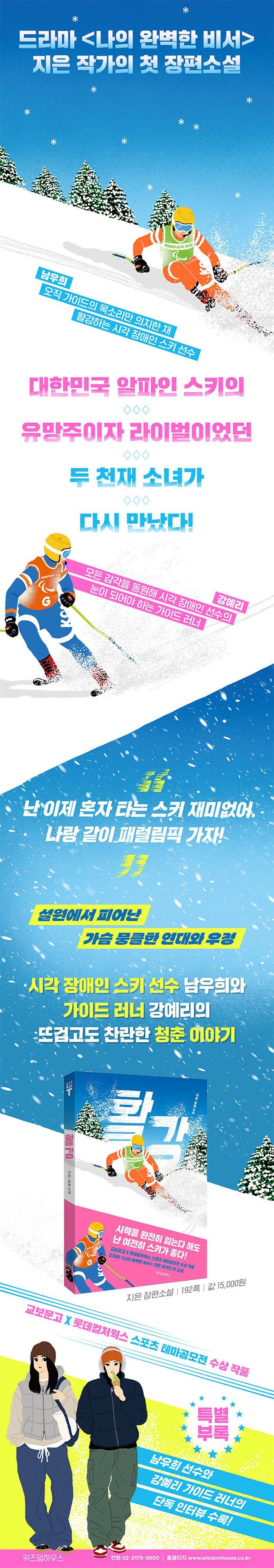 시각 장애인 스키 선수 남우희와 가이드 러너 강예리의 뜨겁고도 찬란한 청춘 이야기. 드라마 <나의 완벽한 비서> 지은 작가의 첫 장편소설이다.