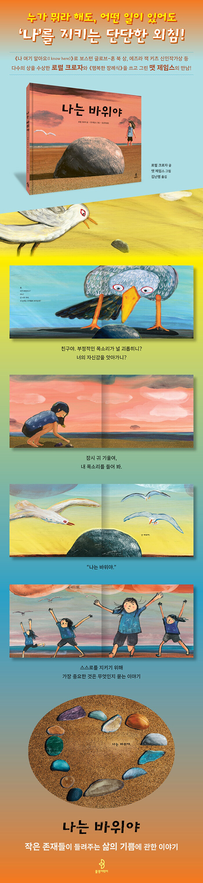 갈매기가 작은 바위를 조약돌이라 부르며 깎아내리지만, 작은 바위는 “난 바위야.” 하고 말한다. 외부의 평가가 존재 가치를 규정할 수 없음을 보여 주며, 자신의 존재를 긍정하고 가치를 믿는 힘이 우리를 단단하게 만든다는 메시지를 전하는 그림책이다.