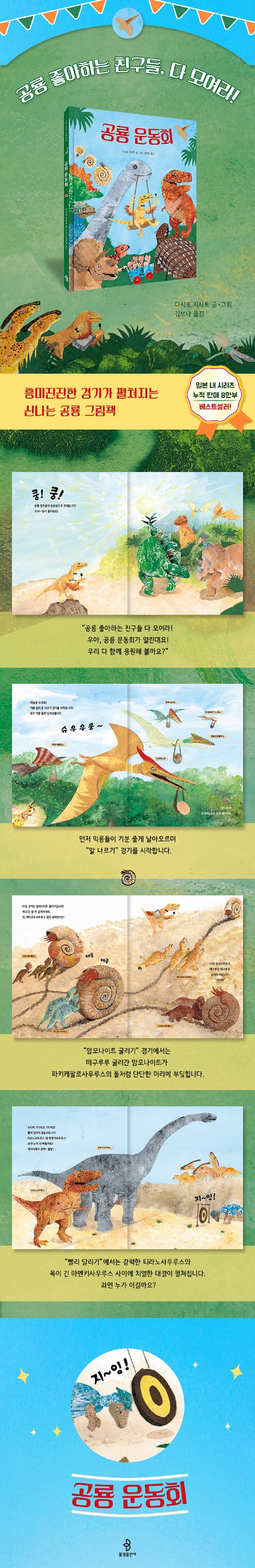 알 나르기, 암모나이트 굴리기, 줄다리기, 장애물 달리기, 빨리 달리기를 겨루는 운동회는 최선을 다해 서로 경쟁하면서도 승패를 떠나 즐기는 공룡들의 모습이 펼쳐집니다. 가끔은 실수도 있고 반전도 있지만, 경기마다 공정한 승부가 펼쳐지는 건강한 공룡 사회를 그리고 있습니다. 작가는 공룡 운동회를 통해 정정당당한 경쟁과 협력의 아름다움을 보여 줍니다. 독자들은 때로는 경쟁하고 때로는 협력하는 공룡들의 모습에 힘찬 응원을 보내게 됩니다.
