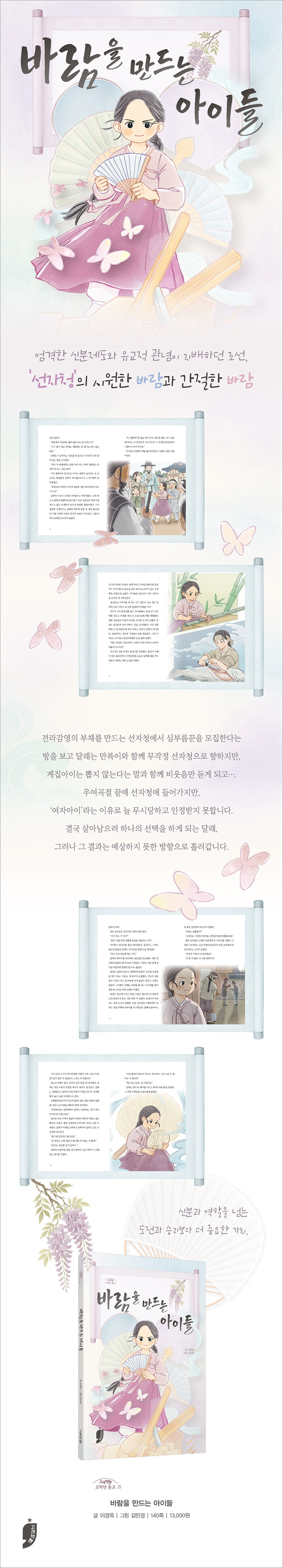 오늘날 에어컨과 같은 바람을 만드는 선자청이라는 역사적 사실을 바탕으로 함께 행복할 수 있다는 재미있고 의미 있는 이야기를 들려준다. 이경옥 작가의 글에 김민경 작가가 협업한 ‘고래책빵 고학년 문고’ 제21권이다.