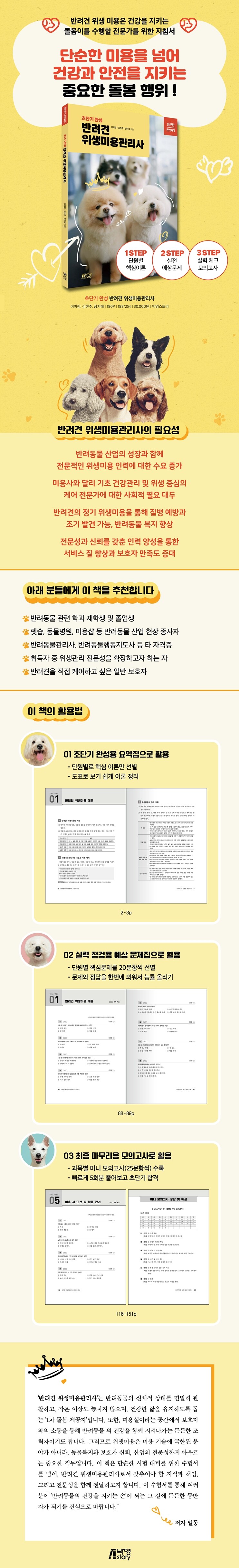 위생미용은 미용 기술에 국한된 분야가 아니라, 동물복지와 보호자 신뢰, 산업의 전문성까지 아우르는 중요한 직무다. 이 책은 단순한 시험 대비를 위한 수험서를 넘어, 반려견 위생미용관리사로서 갖추어야 할 지식과 책임, 그리고 전문성을 함께 전달하고자 한다.