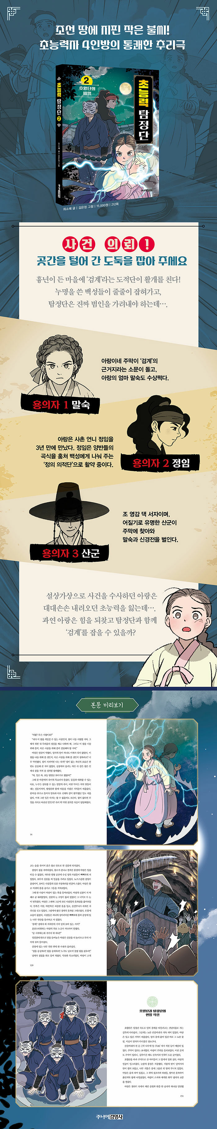 이렇게 혼란스러운 와중에 탐정단 앞에는 풀리지 않는 의문들이 쌓여 간다. 첫 의뢰를 남긴 이는 도대체 누구이며, ‘검계’라는 이름 아래 감춰진 진실은 무엇일까. 이번 2권에서 초능력 탐정단은 진실이란 저절로 드러나는 것이 아니라, 의심하고 확인하며 끝까지 다가가야만 알 수 있다는 사실을 여실히 깨닫는다. 진실과 거짓이 뒤엉킨 어두운 시대에 더듬더듬 길을 헤매며 발을 내딛는 탐정단의 여정이 생생하게 펼쳐진다.