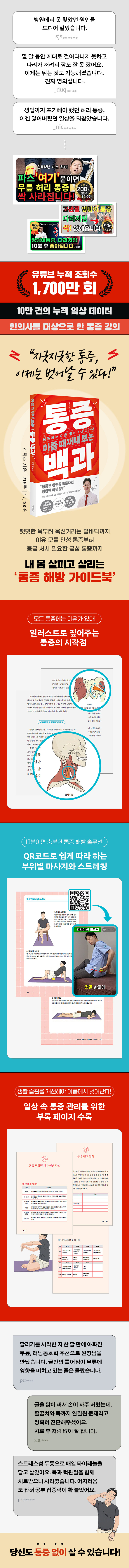 진정한 치료는 병원 문을 나서는 순간 시작된다. 스스로 통증을 꾸준히 관리할 수 있도록, 유튜브에서 폭발적인 반응을 얻었던 ‘통증 자가 관리법’을 빠짐없이 담았다. 파스의 효과를 200% 끌어올리는 올바른 부착법, 통증 완화 속도를 두 배로 높이는 냉·온찜질 노하우, 무너진 자세를 바로잡는 교정법 등 상세한 팁을 아낌없이 공개한다. 통증 관리가 작심삼일로 끝나지 않도록, 수록된 자가 진단 차트와 한 달 관리 루틴, 체크 일지를 활용해보자.