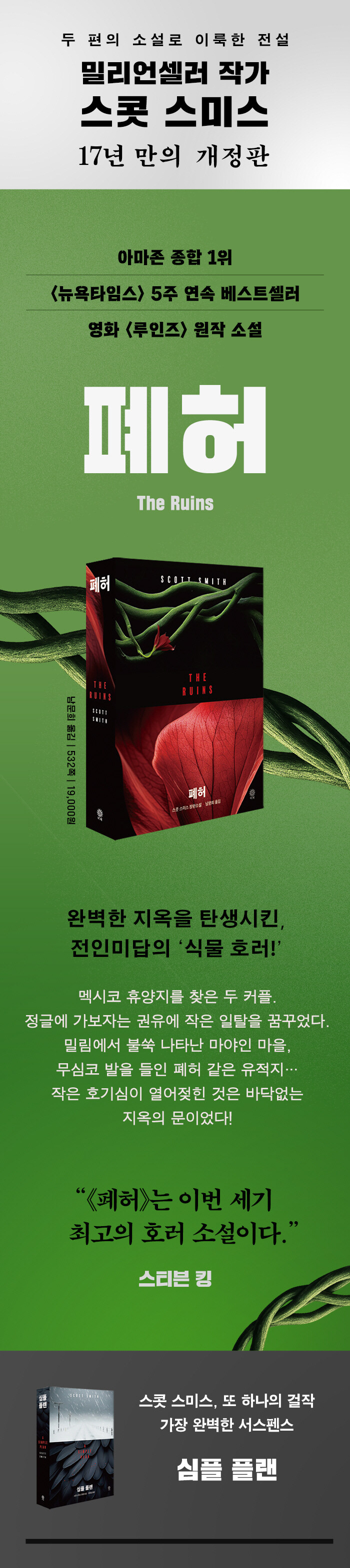 십여 년의 작가 생활 동안 《심플 플랜》과 《폐허》 단 두 권의 소설만을 발표하고, 두 작품을 모두 밀리언셀러로 만든 스콧 스미스. 첫 출간 이후 오랜 시간이 흘렀음에도 이 작품들은 독자 사이에서 끊임없이 추천되며 읽혀왔다. 특히 소설가와 각본가들이 먼저 찾아 읽는 작품으로도 널리 알려져 있다. 장르성과 문학성을 동시에 입증한 드문 사례로, 오늘날 20세기 장르소설의 클래식으로 평가받는다. 비채에서는 정식 한국어판 출간 이후 십칠 년 만에 스콧 스미스의 걸출한 두 작품을 지금의 독자를 위한 감각으로 새롭게 선보인다.