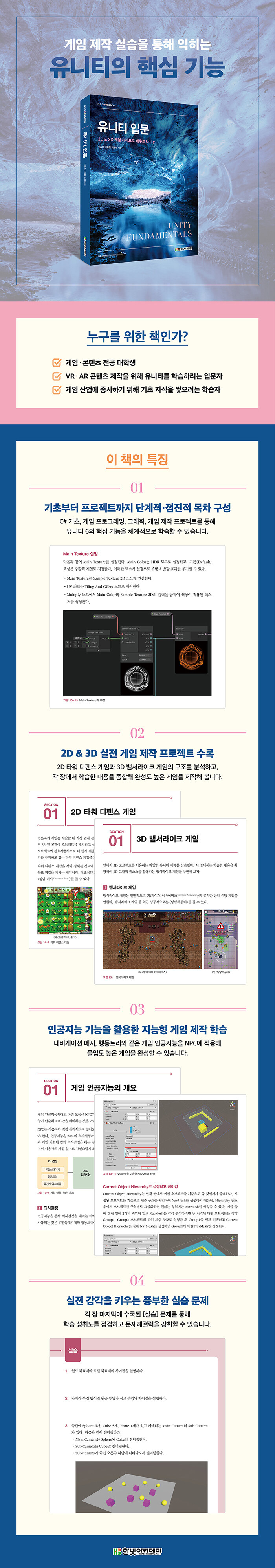『유니티 입문』은 게임 개발을 배우는 학생을 위한 유니티 입문 교재입니다. C# 기초 및 비주얼 스크립팅부터 게임 그래픽, 스크립트를 활용한 기능 구현까지 점진적으로 학습할 수 있도록 구성했습니다. 각 장에서는 예제를 통해 개념을 익히고, 실습 문제로 핵심 내용을 정리하며 자연스럽게 실력을 다집니다. 유니티의 내장 인공지능 기능인 NavMesh 길찾기와 행동트리 예제를 통해, 더 현실감 있고 지능적인 게임을 만드는 방법을 배울 수 있습니다. 마지막으로 '2D 타워 디펜스 게임'과 '3D 뱀서라이크 게임' 종합 프로젝트를 완성하며 하나의 게임을 끝까지 구현하는 과정을 경험합니다. 이 책을 통해 학생들은 자신만의 게임을 직접 기획하고 기발할 수 있는 실무 감각을 기르게 될 것입니다.