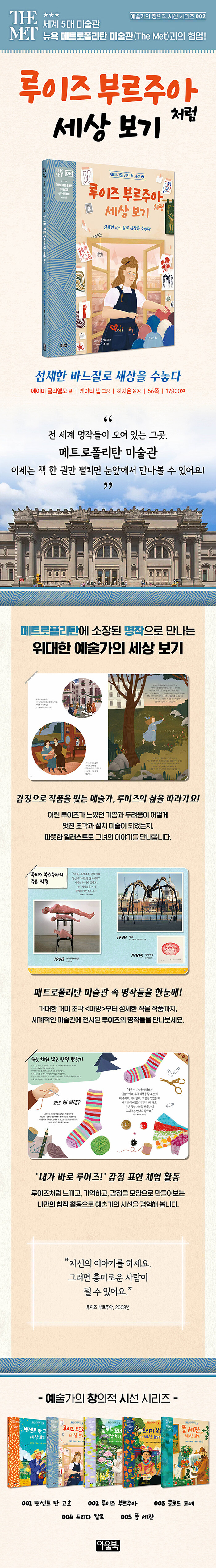 《예술가의 창의적 시선》은 세계적인 영국 출판사 DK와 뉴욕 메트로폴리탄 미술관(The Met)의 합작으로 탄생했다. 이 시리즈는 메트로폴리탄에 소장된 작품을 중심으로 위대한 예술가들의 작품을 만날 수 있다. 시리즈의 두 번째 책은 천과 바늘로 세상을 수놓은 루이즈 부르주아의 이야기다.