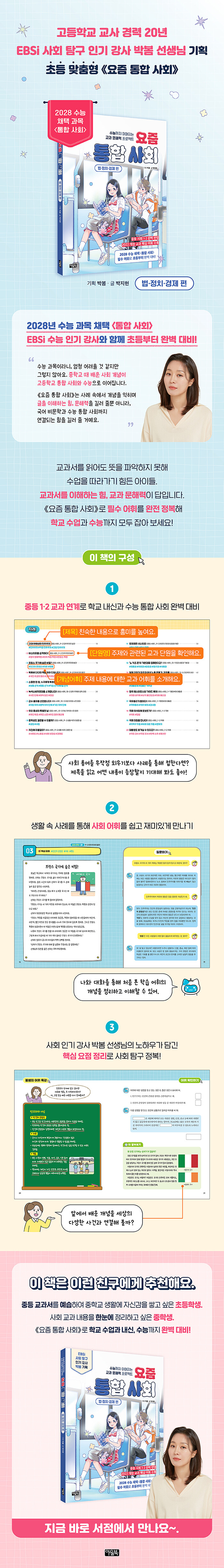 2028학년도 수능부터 〈통합 사회〉가 문·이과 공통 시험 과목으로 채택이 된다. 이에 20년 경력 전 고등학교 교사이자 EBSi에서 사회 탐구 강사로 활약해 온 박봄 선생님은 “아이들이 중학교 때 사회 개념어만 제대로 익히면, 고등학교 통합 사회, 나아가 수능까지 확실히 대비할 수 있다.”라고 강조하며 이 책을 만들었다.