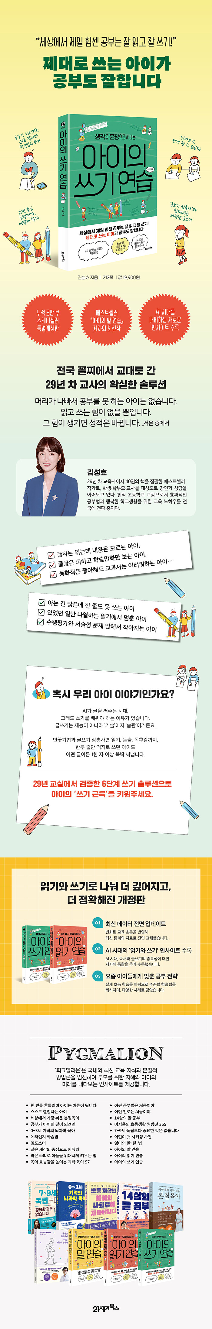 30여 년간 초등 교육자로 활동해 온 저자는 교사이자 엄마로서 쌓아 온 글쓰기 지도 노하우를 이 책에 담았다. 이 책을 통해 부모가 조금만 관심을 기울여 아이가 글쓰기 방법을 익히고 연습할 수 있도록 일상에서 지도한다면, 아이는 더 이상 책 읽기와 글쓰기를 어렵게 느끼지 않게 될 것이다. 그 과정에서 문해력은 물론, 이를 바탕으로 한 학습 능력도 자연스럽게 향상될 것이다.