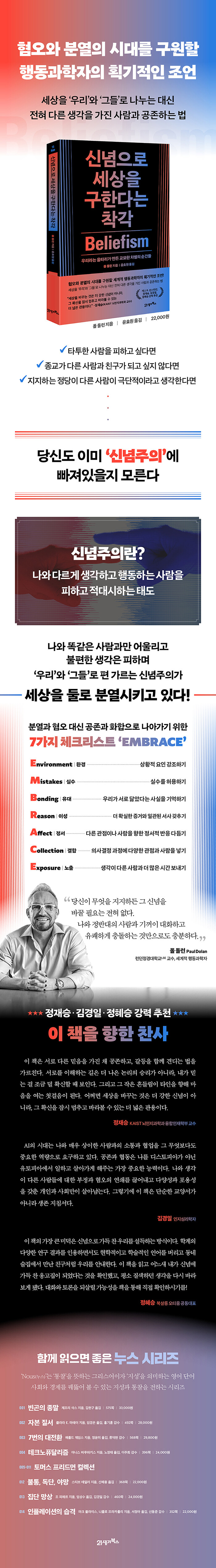 저자는 다양한 사례와 연구자료를 통해 자신의 신념만 고수하며, 타인을 이해하지 않고 빠르게 분류하고 더 쉽게 배제하는 신념주의를 집요하게 파고든다. 그리고 나와 똑같은 사람과만 어울리고, 불편한 생각은 피하는 신념주의가 사회의 다양성을 해치며, 무분별한 차별과 혐오로 이어지고 있음을 지적한다.
