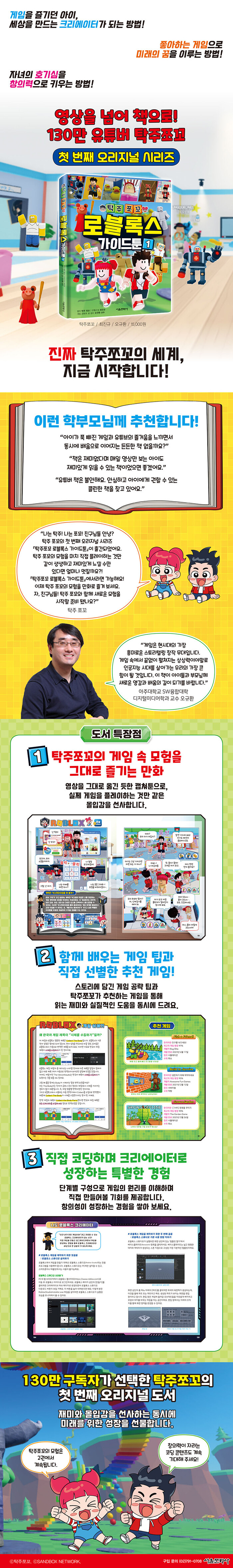 130만 유튜버, 탁주쪼꼬가 엄선한 아홉 가지 로블록스 게임을 소개하는 <탁주쪼꼬 로블록스 가이드툰>이 출간되었다. 로블록스는 전세계 어린이들이 즐기는 게임인 동시에, 초등 프로그래밍 및 코딩 교육에도 많이 활용되는 복합 콘텐츠이다.