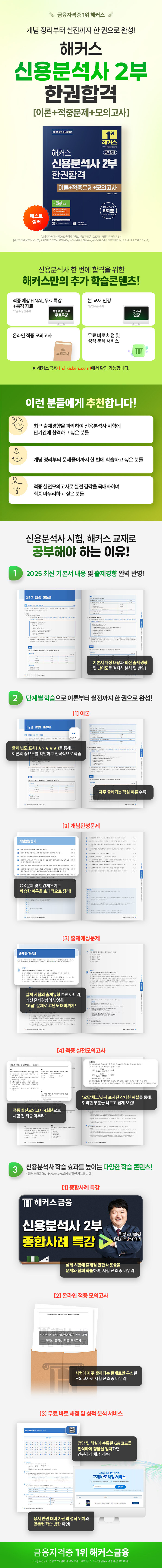 · 제목 : 2026 해커스 신용분석사 2부 한권합격 이론 + 적중문제 + 모의고사 5회분 (실전모의고사 5회분|종합사례 특강|무료 바로 채점 및 성적 분석 서비스|2주 완성)