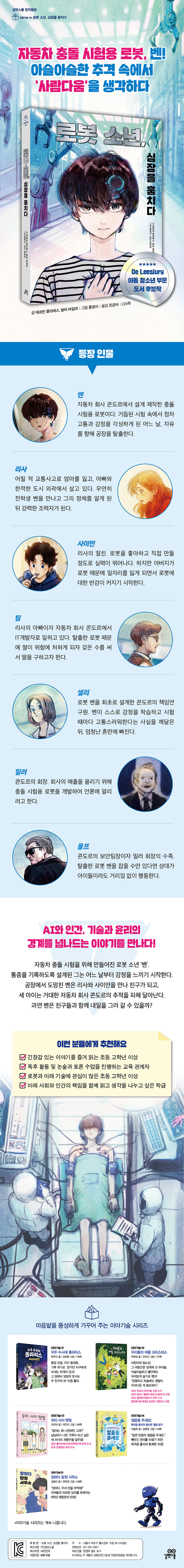 벤이 고통 속에서 인간적인 ‘감정’을 학습하고, 친구들의 우정 속에서 ‘희생’의 가치를 배우는 과정은 이 책이 단순한 모험 소설이 아닌 따뜻한 성장 동화임을 확실하게 알려 준다. 아이들은 이 작품을 통해 첨단 과학 기술 시대를 살아갈 윤리적 가이드라인을 스스로 고민해보고, 진정한 친구의 의미를 되새기는 소중한 경험을 하게 될 것이다.