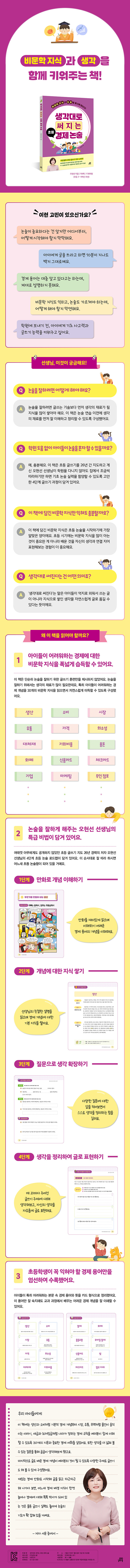 이 책은 단순히 논술을 잘하기 위한 글쓰기만을 연습하도록 만든 교재가 아닙니다. 논술을 잘하기 위해서는 글을 쓰는 기술뿐만 아니라 생각을 풍부하게 만드는 다양한 배경 지식이 필요한데요, 특히 아이들이 어려워하는 경제 개념을 자연스럽게 이해할 수 있도록 30가지 주제의 비문학 지식을 담았습니다. 각 주제의 개념을 쉽고 재미있게 풀어내어, 아이들이 읽으면서 경제 원리를 스스로 깨닫고 생각의 폭을 넓힐 수 있도록 구성했습니다. 이렇게 차근차근 지식을 쌓아가다 보면, 경제뿐만 아니라 글쓰기와 사고력까지 함께 성장하는 효과를 얻을 수 있습니다.