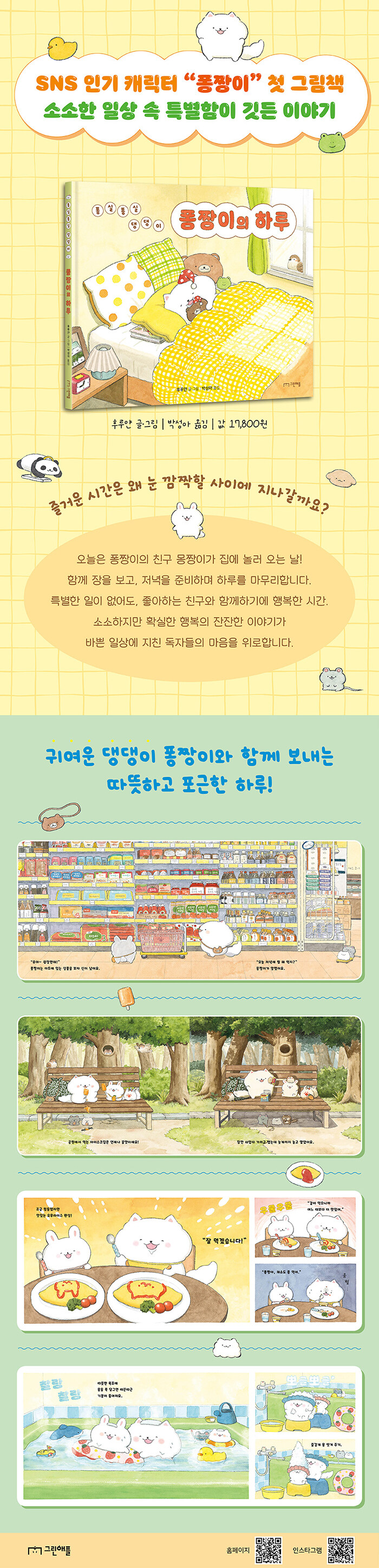 SNS에서 많은 사랑을 받고 있는 캐릭터, 천진난만한 흰 강아지 퐁짱이의 첫 그림책이다. 귀엽고 사랑스러운 퐁짱이 친구들의 소소하고 평화로운 하루를 담은 이야기로, 어린이부터 어른까지 모두에게 따뜻한 위로를 전한다.