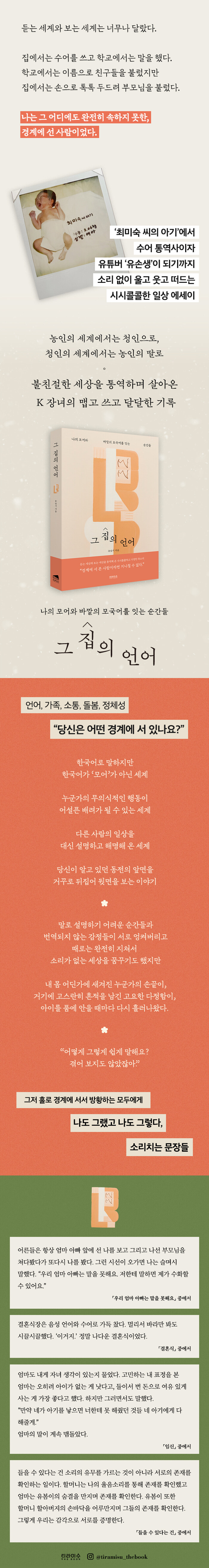 『그 집의 언어』는 바로 그 지점에서 농인과 청인을 다루는 평평한 이야기의 범주를 넘어선다. 그간 세상에 받아온 생채기와 자기만의 세계를 형성하며 거쳐 간 고민을 고스란히 드러내는 솔직한 문장은 같은 일을 겪어 본 적이 없는 사람이더라도 경계인이라면 누구든 공감할 수 있을 뿐만 아니라 어느새 작가를 열렬히 응원하는 자신을 발견하게 된다.