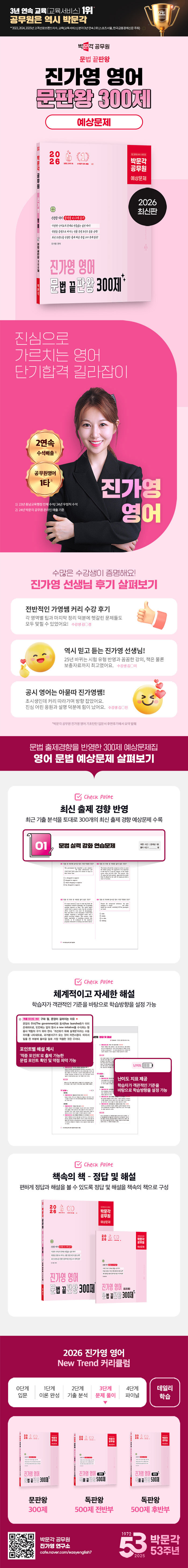 · 제목 : 2026 박문각 공무원 진가영 영어 문법 끝판왕 300제 (문판왕) (박문각 공무원 9급 시험대비 진가영 영어 문법 예상문제집)