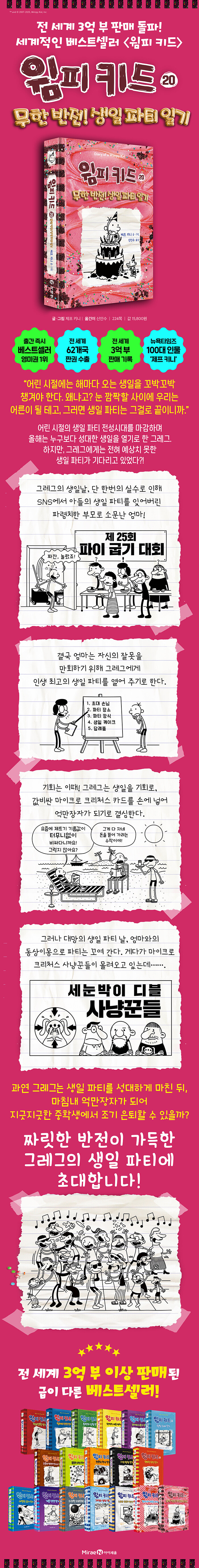 <윔피 키드>의 스무 번째 신간, 《윔피 키드 20. 무한 반전! 생일 파티 일기》에서는 그레그가 벌이는 엉뚱한 생일 파티가 예측 불가능한 반전 속에 펼쳐진다. 생일이 다가오자, 그레그는 가족들이 준비한 깜짝 생일 파티 계획을 자신이 눈치챘다고 착각하며 잔뜩 설레는 날들을 보내는데...